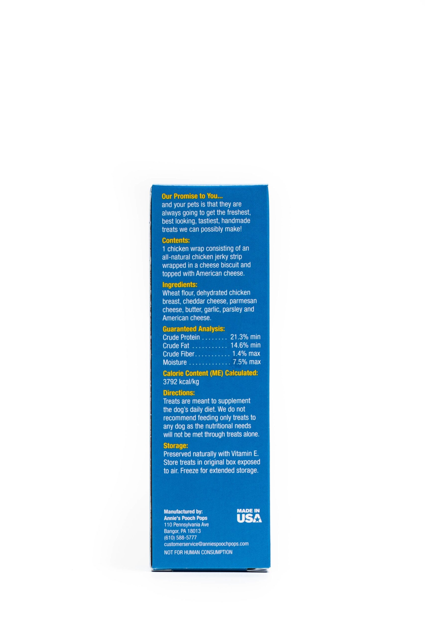 Annie's Chicken Wrap - the paw-licking good treat that will have your furry friend begging for more! Each Annie's Chicken Wrap is lovingly crafted with a blend of wheat flour, dehydrated chicken breast, cheddar cheese, parmesan cheese, butter, parsley, and a sprinkle of American cheese for that extra yum factor. Packed with all the goodness your pup craves, these treats are sure to get tails wagging!