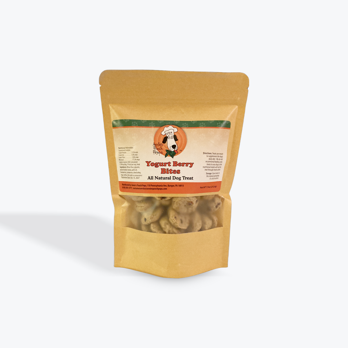You will receive three 7.5 oz bags of Yogurt Berry Bites! Mixed with cranberries, blueberries, peanut butter, honey, and vanilla, this snack pack will have your furry friend begging for more. Each bite is bursting with flavor and goodness, making it a treat your dog will go mutts for!