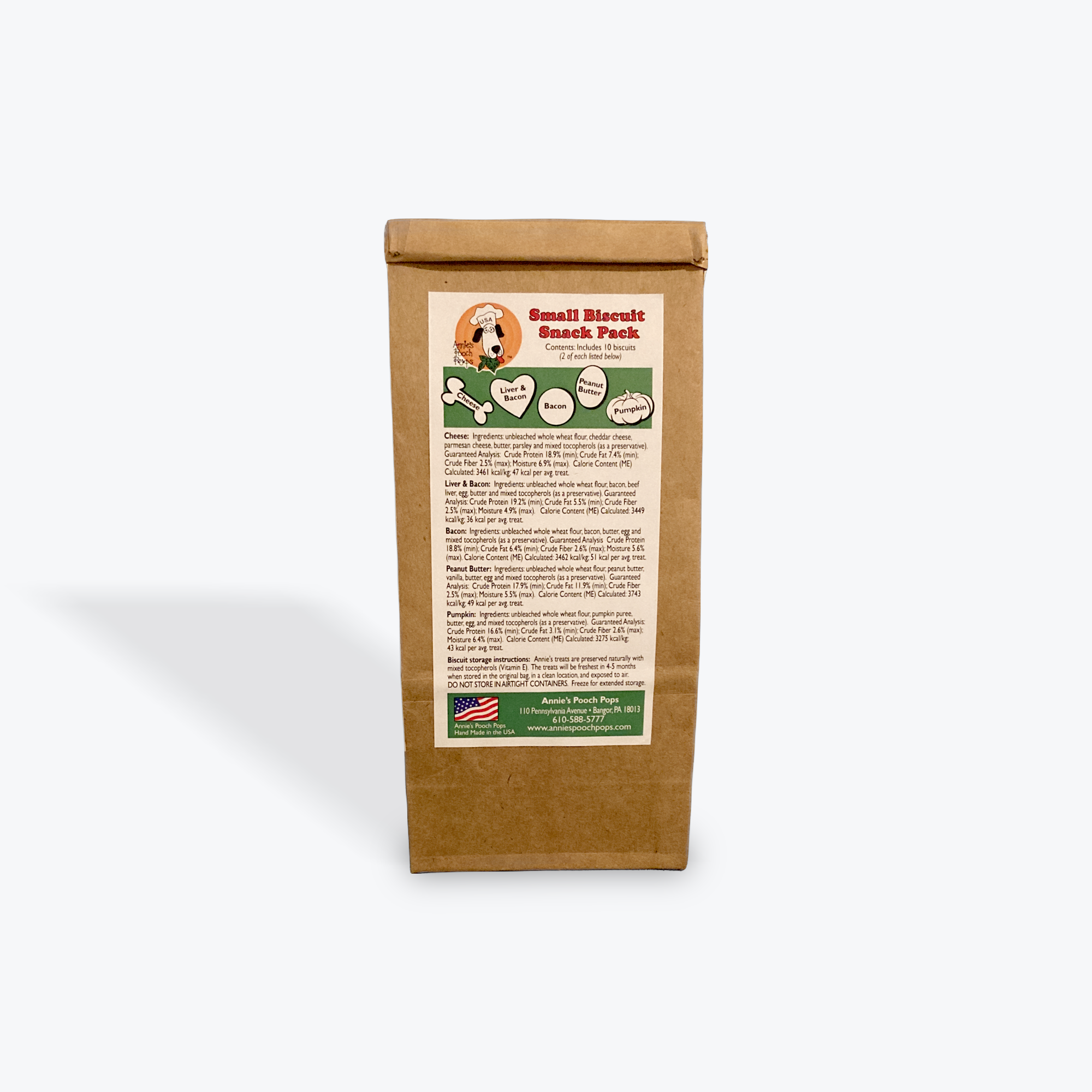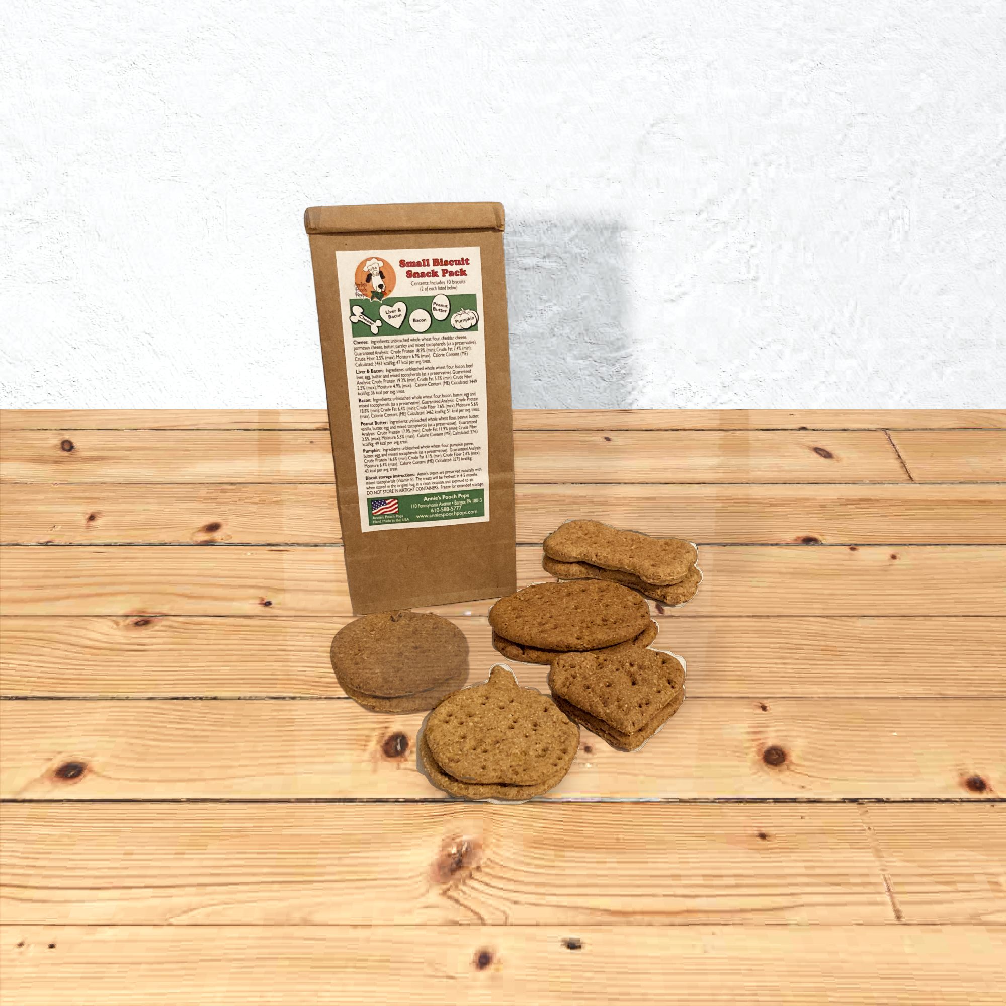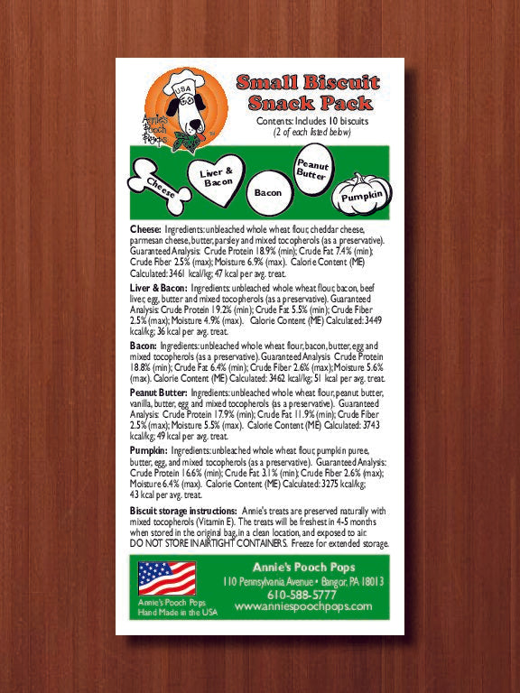 Each individual pack contains 2 of each delightful flavor: Peanut Butter, Bacon, Liver & Bacon, Pumpkin, and Cheese. From savory to sweet, there's a biscuit for every craving!