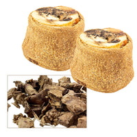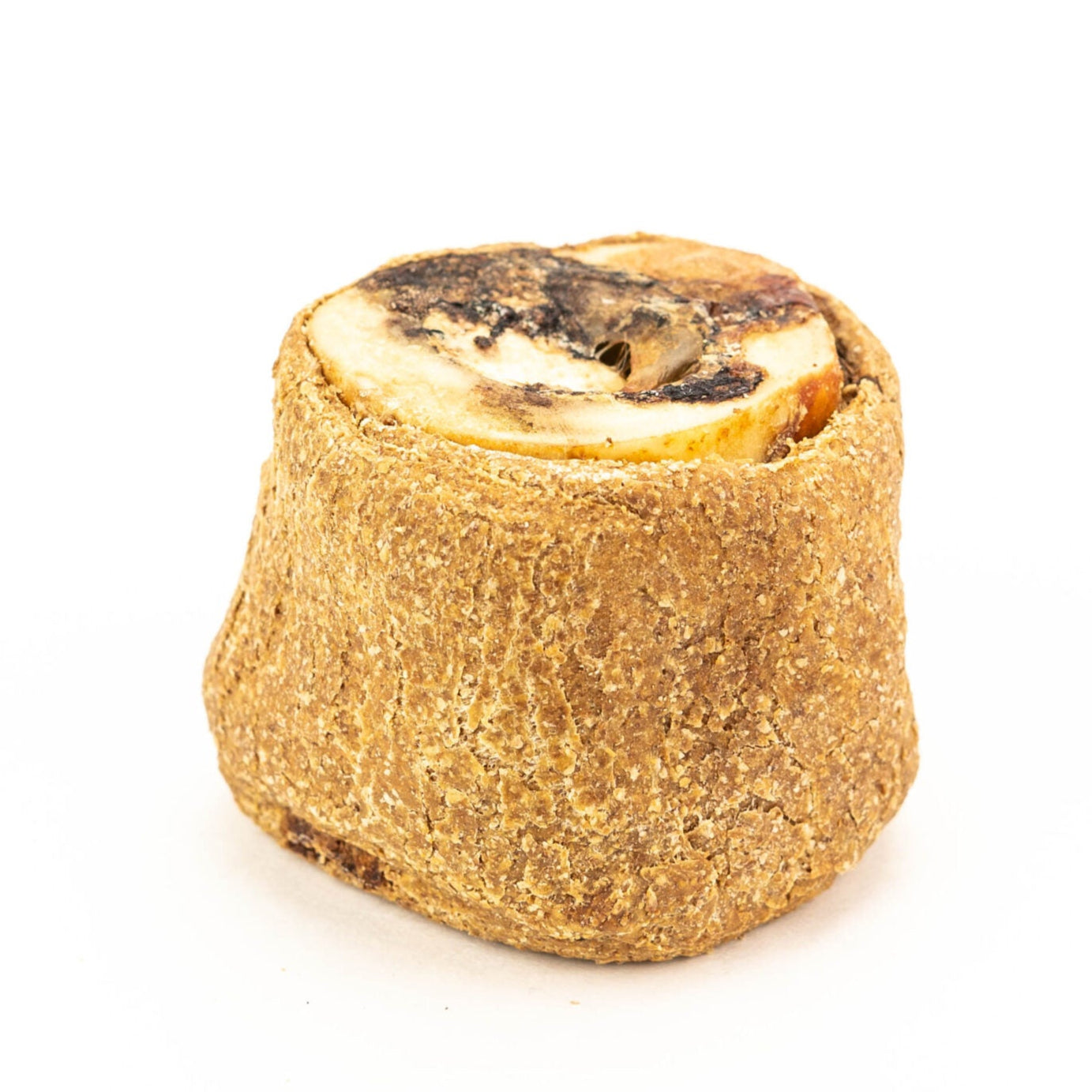 A chewer's dream! Each handcrafted Muttkin features a human-grade beef marrow bone sourced from top-notch USA purveyors, wrapped in a peanut biscuit made with wheat flour, peanut butter, eggs, butter, and vanilla. Measuring approximately 3" x 3" x 2.5" and weighing around 7 oz, these treats keep your furry friend happily occupied for hours. Perfect for tough chewers or any pup who loves a tasty, long-lasting treat!